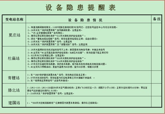 2.1 設(shè)備隱患提醒表:匯總變電站存在的異常信號(hào),且在短時(shí)間內(nèi)無法處理的隱患(例如:滕北站發(fā)“216開關(guān)保護(hù)裝置異常”發(fā)后隨即復(fù)歸,檢修部門無法捕捉檢查)。監(jiān)控值班員在監(jiān)控過程中,可以通過此表跟蹤并加強(qiáng)監(jiān)視,及時(shí)匯報(bào),提高值班員的判斷能力。