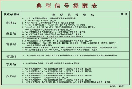 2.2 典型信號(hào)提醒表:此類信號(hào)并不是設(shè)備異常信息,但在工作中會(huì)時(shí)不時(shí)的發(fā)出,在判斷上容易產(chǎn)生誤導(dǎo),為了避免不必要的精力支出,我們將這類信號(hào)匯總提醒值班員。例如:220KV開關(guān)收發(fā)信機(jī)動(dòng)作信號(hào)、備用開關(guān)的異常信號(hào)等都可以通過此表來排除,加強(qiáng)設(shè)備巡視與監(jiān)控質(zhì)量。